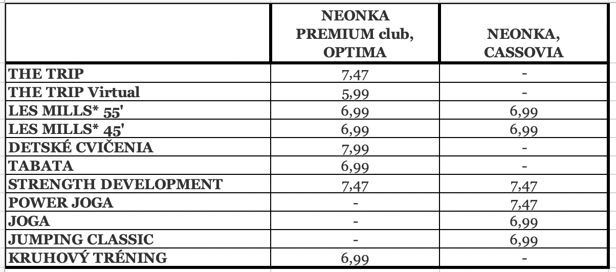 *Cvičenia Les Mills , ktoré sú aktuálne ponúkané na danej prevádzke: BodyAttack, BodyPump, BodyCombat, LM Shapes, LM Core, The Trip, RPM, Sprint, Strength Development, LM Grit + Core, BodyBalance, Jumping Classic, BodyStep